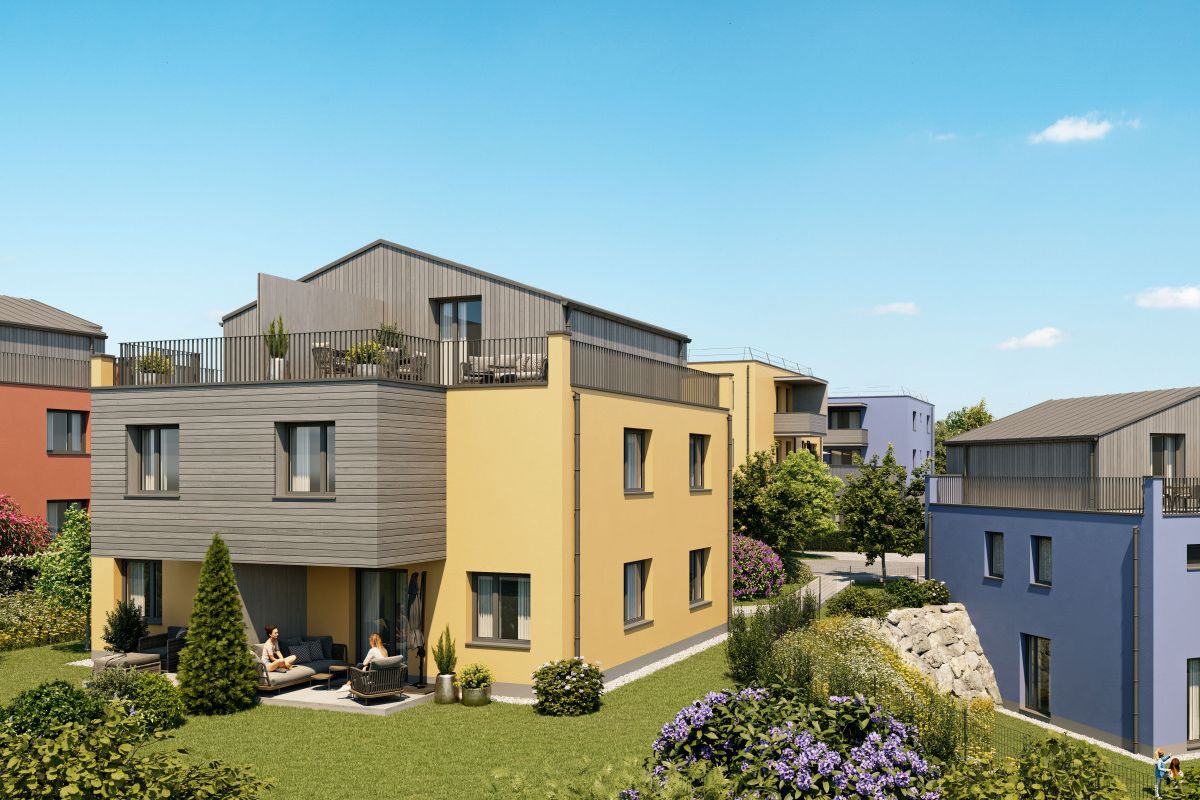 Private Gärten mit Terrassen laden zum Verweilen im Grünen ein, während Dachterrassen zusätzliche Rückzugsorte mit Weitblick schaffen – perfekte Plätze für entspannte Abende oder gemeinsame Stunden mit Familie und Freunden.
